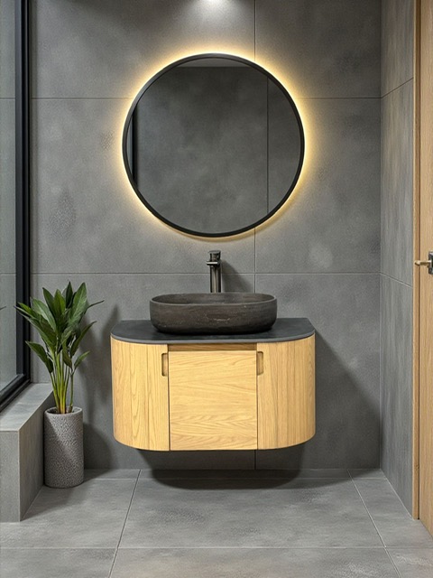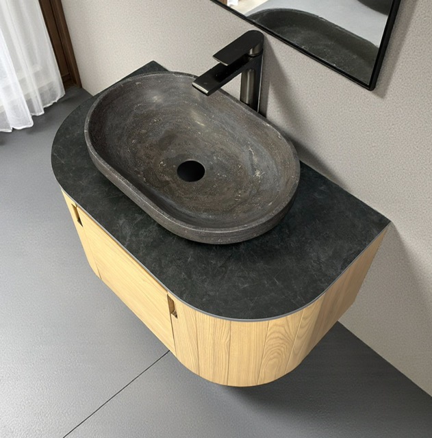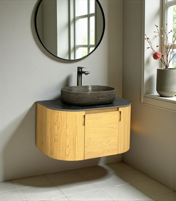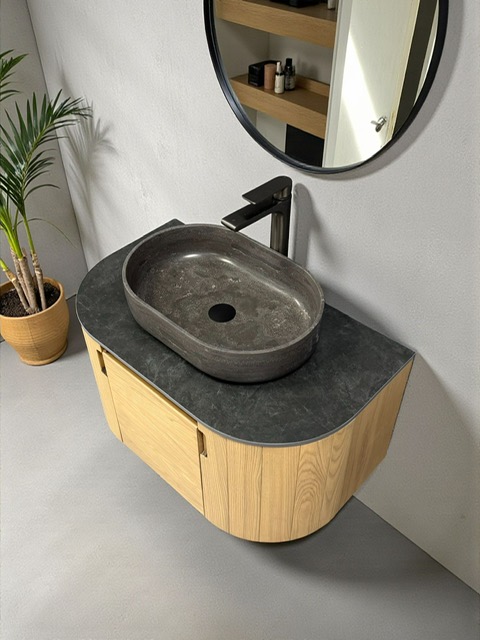 Maak het badmeubel “Seattle 80E-TBG” compleet met een waskom, kraan en spiegel.