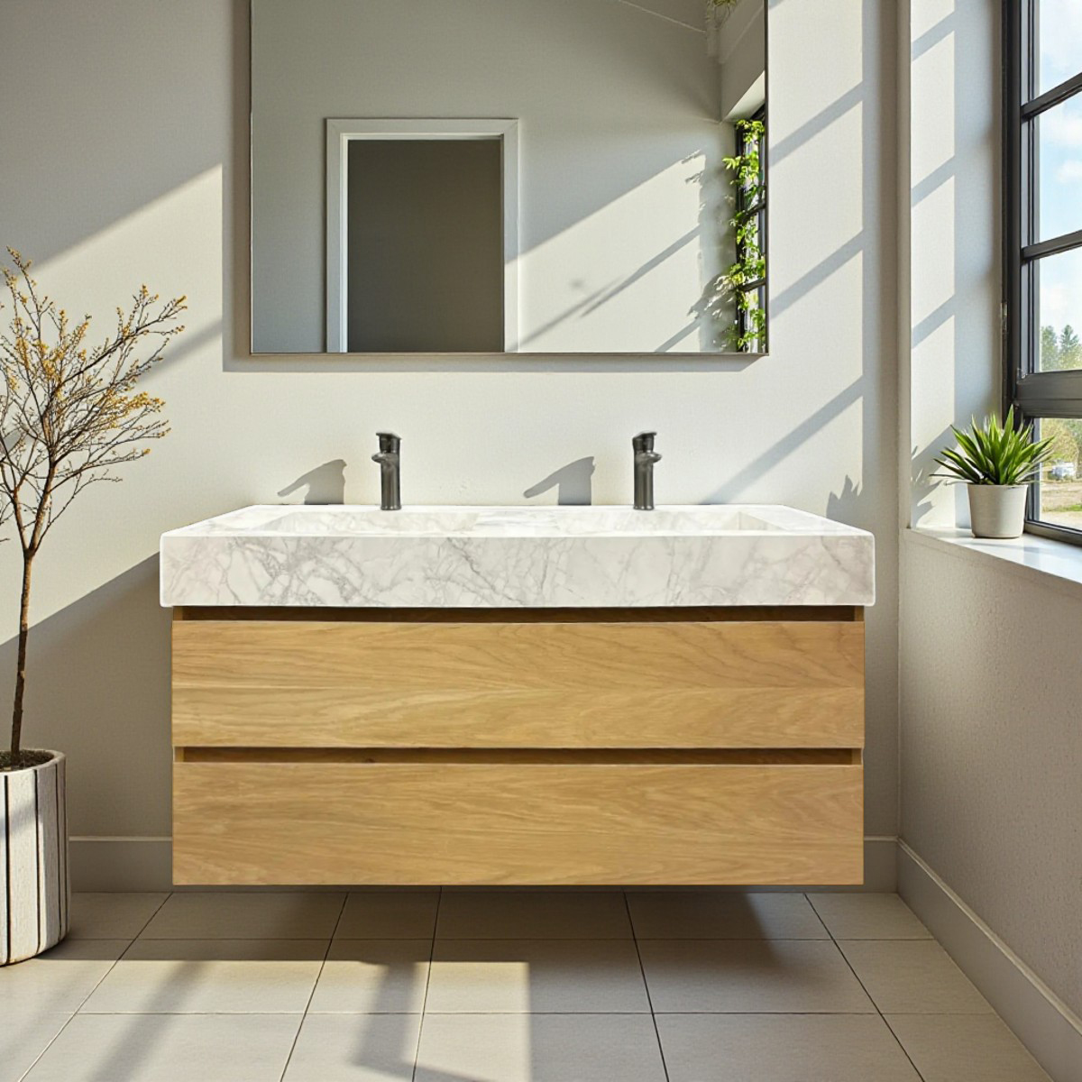 De badkamermeubelen zijn prominent aanwezig. Hierbij is het belangrijk om van te voren de ruimte op te meten en uit te tekenen waar u alles wilt gaan plaatsen. Aan de hand van deze metingen/plattegrond kunt u meubelen uit gaan zoeken die de juiste afmetingen hebben en zo perfect in de badkamer passen.
