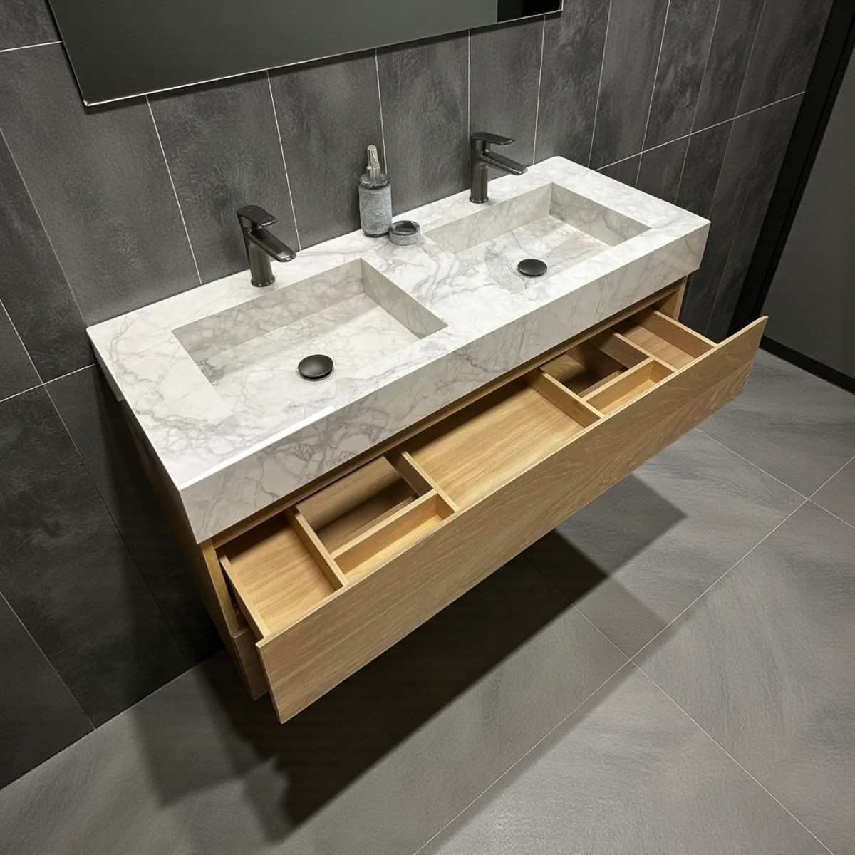 Er wordt veel aandacht en zorg besteed aan de inrichting van de badkamer.