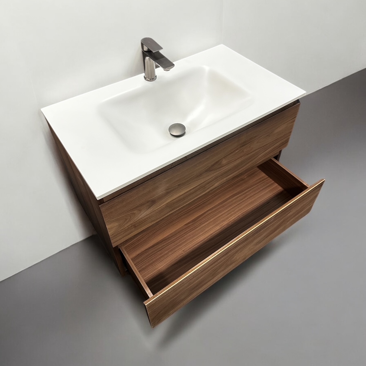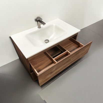 Maak het badmeubel “Boston-W80” compleet met een badkameropbergkast, spiegel, kraan en afvoerplug.