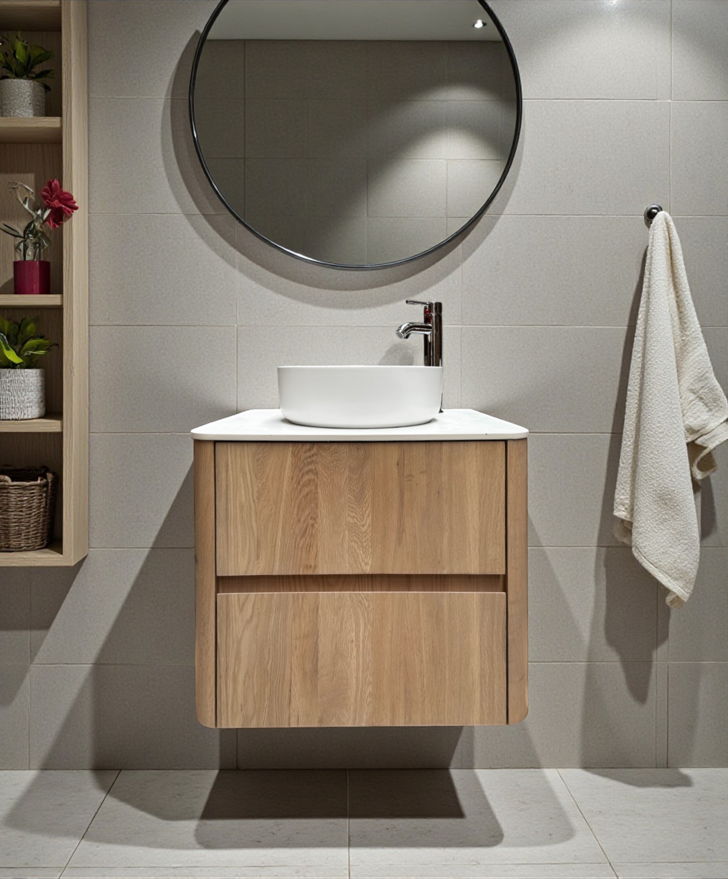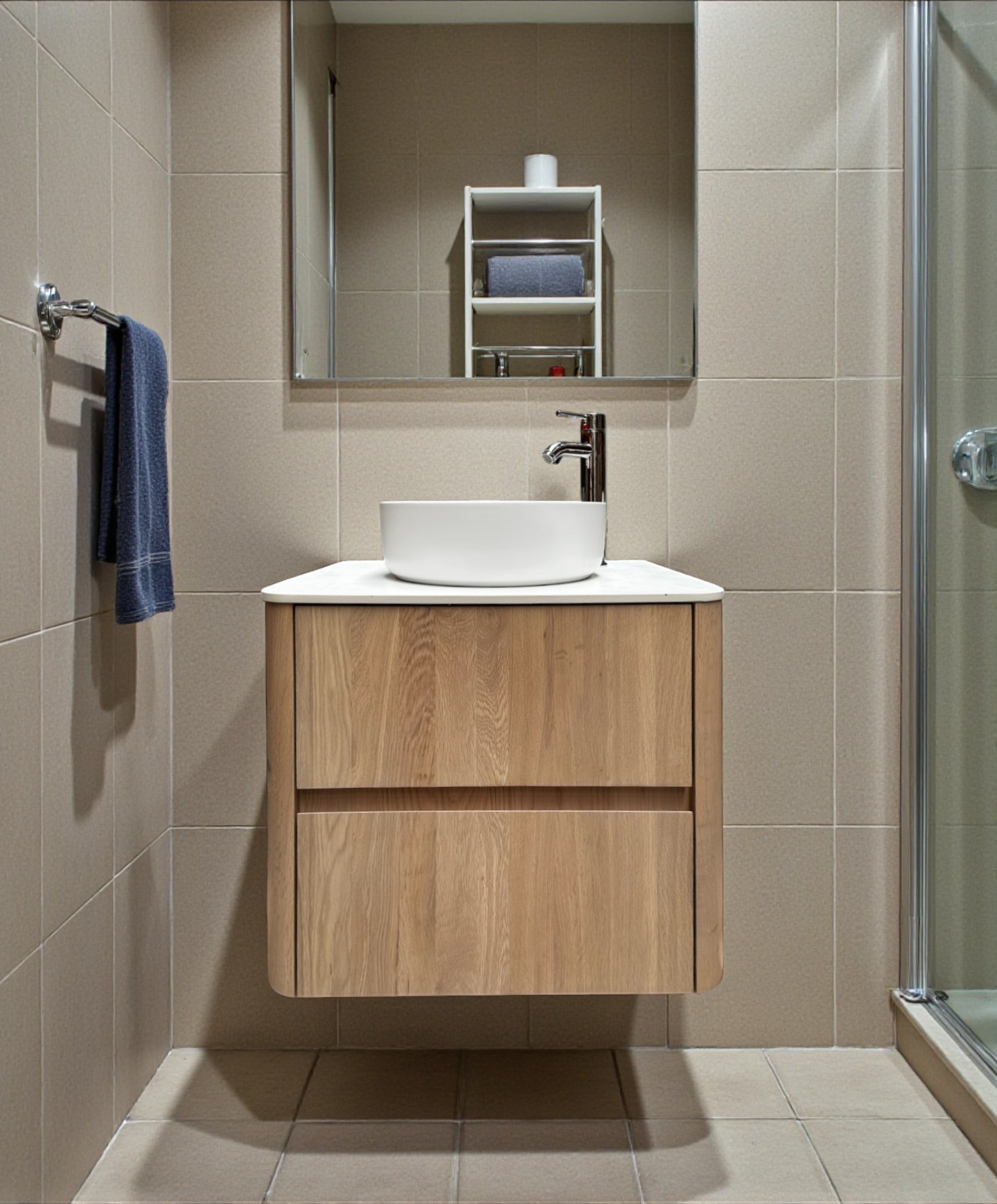 Maak het badmeubel “Seattle 60-TBW” compleet met een waskom, kraan, spiegel en kolomkast.